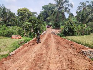 Dalam foto terlihat salah satu anggota Satgas TMMD ke-126 sedang melakukan pengecekan kondisi jalan hasil pembukaan yang membentang di antara area persawahan dan perkampungan warga. Jalan tersebut kini sudah tampak terbentuk dengan lebar dan struktur yang memadai untuk dilalui kendaraan roda dua maupun roda empat.