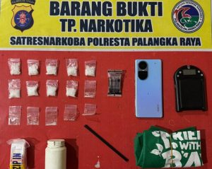 Kasatresnarkoba Polresta Palangka Raya AKP Agung Wijaya Kusuma menjelaskan, dari hasil olah TKP, ditemukan sejumlah barang bukti lainnya berupa timbangan digital, sendok sabu, plastik klip, botol permen, tas warna hijau, serta satu unit handphone Oppo Reno 10 yang digunakan pelaku untuk transaksi.