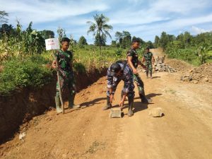 Dalam pelaksanaan di lapangan, para anggota Satgas TMMD tampak bekerja bersama warga menata dan meratakan batu-batu yang telah diturunkan dari truk pengangkut material. Proses pengerasan jalan ini menggunakan campuran batu belah, batu koral, dan tanah urugan agar jalan menjadi kuat dan tahan terhadap perubahan cuaca. Selain itu, pengerjaan dilakukan dengan penuh semangat dan kebersamaan, menggambarkan kuatnya sinergi antara TNI dan rakyat dalam mendukung pembangunan daerah.