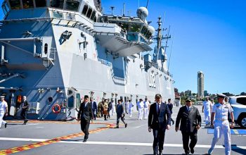 Presiden Republik Indonesia Prabowo Subianto menyampaikan apresiasi kepada Pemerintah Australia atas penyambutan hangat selama kunjungan kenegaraannya. Apresiasi tersebut disampaikan saat pernyataan pers bersama Perdana Menteri Australia Anthony Albanese usai meninjau Kapal HMAS Canberra di Garden Island Naval Base, Sydney, Australia, pada Rabu, 12 November 2025.