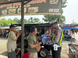 Tim sosialisasi yang terdiri dari Kanit Kamsel Satlantas Polres Pekalongan dan anggotanya menyasar langsung para pedagang dan pengunjung di Pasar Hewan Kesesi.