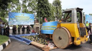 Botol-botol miras tersebut dimusnahkan dengan cara dilindas menggunakan alat berat, disaksikan oleh seluruh tamu undangan sebagai bentuk komitmen bersama memberantas peredaran miras di wilayah Kabupaten Pekalongan.